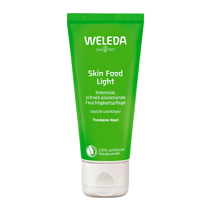 Durstlöcher für die trockene HautMit dieser Skin Food Light von Weleda spenden Sie Ihrer Haut ausreichende Feuchtigkeit. Sie sorgt für ein angenehmes Hautgefühl.Hören Sie Ihre Haut nach Feuchtigkeit rufen? Dann sind Sie mit der Skin Food Linie von Weleda bestens beraten. Die Light Version ist für alle, die der Haut Feuchtigkeit spenden möchten, aber sich eine leichte Pflege wünschen. Sie zieht schnell ein und versorgt Ihre Haut mit intensiver Feuchtigkeit. Ihre seidige Textur ist reichhaltig und enthält wertvolle Pflanzenextrakte. Sie wirkt hautberuhigend und hinterlässt eine wohlwollendes Hautgefühl. Durch die praktische Größe ist diese Pflege auch perfekt für unterwegs geeignet. Gerade bei Wechsel-Wetter pflegt sie Ihre Haut. Mit nur einer Creme können Sie den Durst für Gesicht und Körper stillen. Sie gibt Ihrem Gesicht eine frische Aura.Auch in 75ml erhältlich!Hauttyp: Für jeden Hauttyp geeignet. Besonders für die trockene Haut geeignet.Ihre Vorteile im Überblick: spendet intensive Feuchtigkeit zieht schnell ein wirkt hautberuhigend angenehmes Hautgefühl praktisch auch für unterwegsAnwendung: Massieren Sie die Skin Food Light punktuell auf die rauen Hautstellen wie Ellbogen, Knie und Füße ein.